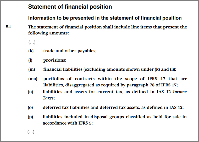 Excerpt of IAS 1 paragraph 54, amounts to be presented within the liabilities of the company