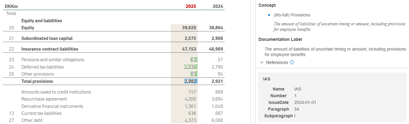 As shown above, when Tryg itself marked up the amount next to ‘Total provisions’, it declared it to correspond to the standard definition of ‘provisions’ in IFRS, i.e. to the item described in IAS 1.54(l).